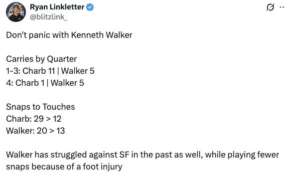 Hey, nobody should be mad that the Charbonnet plays worked sometimes, but at the same time let’s be honest about the running game and the run blocking in general against the 49ers: It wasn’t very good. And for that reason, I’m not going to give up on Kenneth Walker after one game in which the blocking failed him.