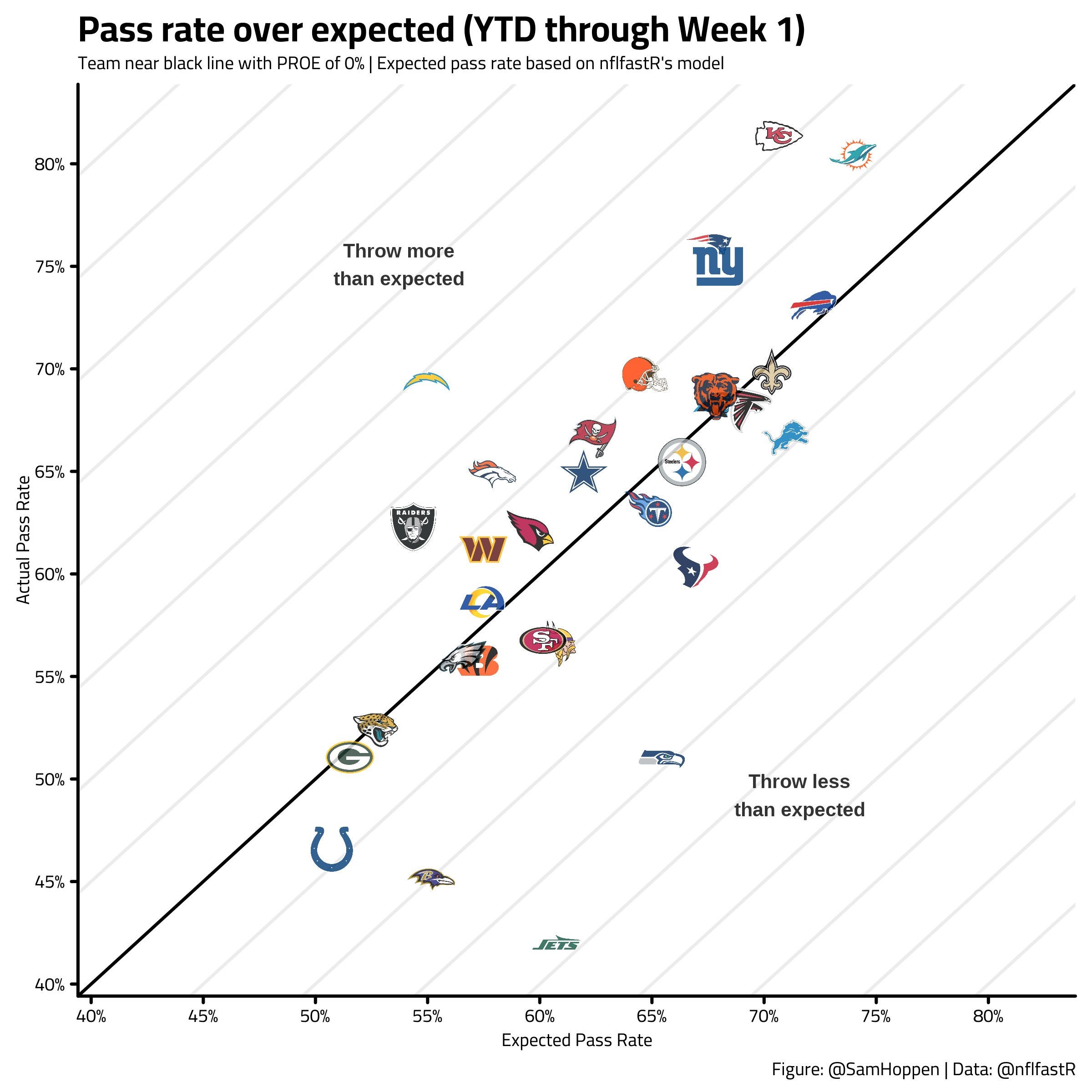 I think Sam Darnold was good, I think the pass protection was good, and that’s at least a step in the right direction. I think the play calling may have actually been an overcorrection of last year’s hesitation to run the ball by Ryan Grubb. According to this chart, the Seahawks threw the ball 15% less often than the expectation based on down, distance and situation, putting them way off of the average: