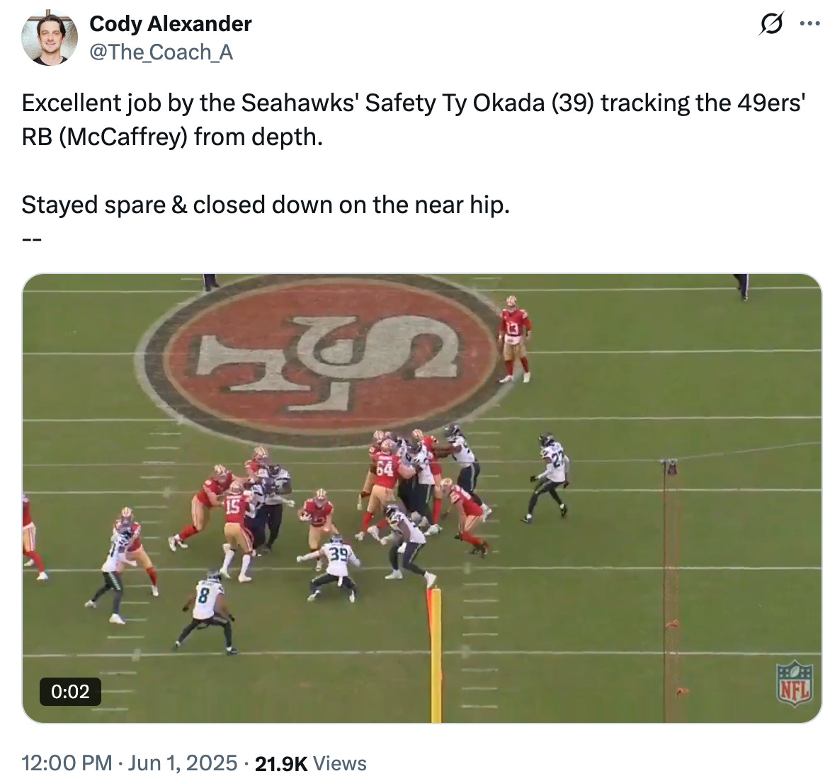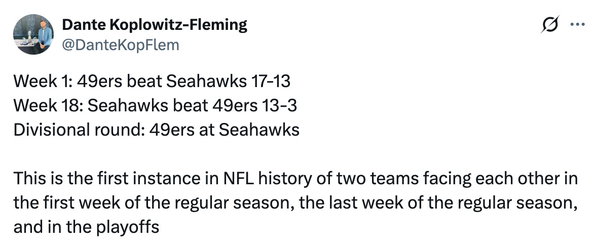 Does it matter that the Seahawks have overhauled their coaching staff since 2024 and coincidentally (or intentionally) tapped into more people who know Shanahan and Purdy — doubling-down in 2025 with Kubiak/Darnold — behind the scenes? I don’t know but Purdy’s last three games against the Seahawks are the three-worst he’s ever had against Seattle, a team he posted a career-high Y/A game against in 2023.