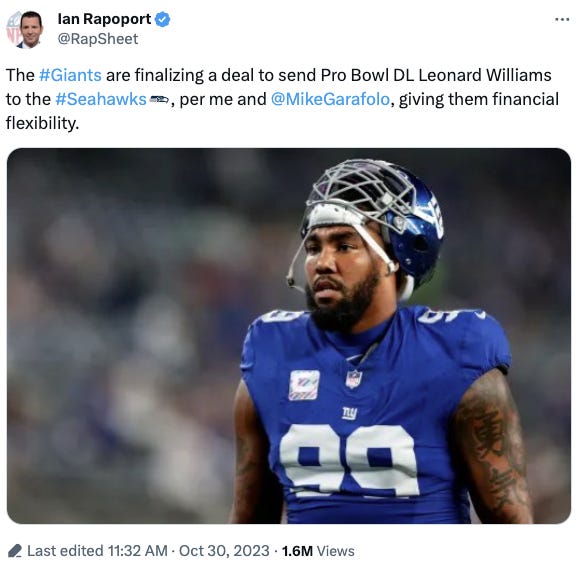 I like this trade a lot. It gives them extra depth on the DL and will help reduce the workload for Dre'Mont and Jarran. Everyone seems to be pulling their weight as it is, and this will help make things better. And if Williams can help with the pass rush as well, it's a bonus and should help Mafe/Hall/Taylor too.