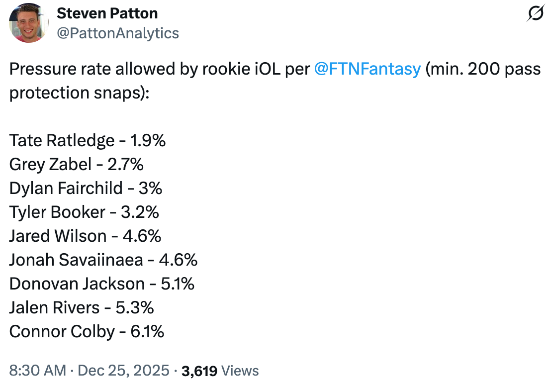 Yeah, Chicago paid a lot of money for it — and who knows if it will carry over into the playoffs or 2026 — but the Bears also weren’t willing to take the same risks with unproven rookies/rookie contract players that the Lions (and Seahawks) did and while those moves could pay off for Detroit and Seattle eventually…we can probably all agree that the Seahawks are overcoming their guards and centers to win more so than winning because of them.