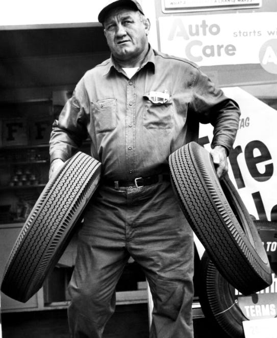 The game featured Hall of Famers Nagurski and Grange playing for Halas against Steve Owen’s Giants; As was shared in the Seaside Joe comments recently, this NFL Throwback video on how players have evolved in the last 100 years is a great watch and mentions how Nagurski also became a championship wrestler in the 1930s alongside his NFL career. And then later he opened up his own service station, the 1950s version of a podcast: