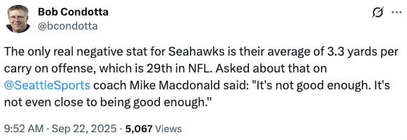 The run game is really the only part of the Seahawks game that is yet to be unleashed. Run defense, pass defense, passing offense, and special teams are all in a good to great spot. Hopefully the consistency will come in time. Lots of learning going on with a young offensive line. Pass pro has been solid, so that's a plus.