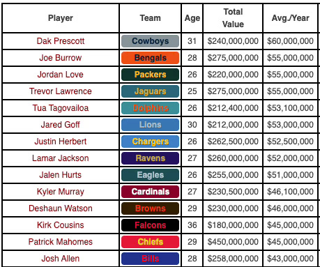 The only two quarterbacks higher than Goff are Mahomes and Allen, probably 2 of the 3 most individually-important quarterbacks in the NFL next to Lamar Jackson. Then you look at Jackson, maybe a bargain at $32.4 million this season, BUT…
