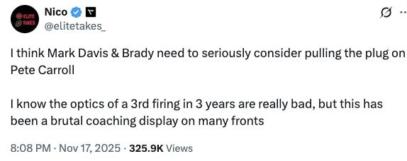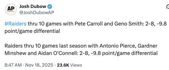 It hasn’t been easy to watch Pete Carroll’s legacy get Raiderized and it was the last thing that I expected to happen when Las Vegas hired him because for over 30 years the worst his team has ever been is “mid”. Barring a miracle, 2025 will be the first time a Carroll coached team has flirted with being the worst in the NFL or college since he was defensive coordinator of the 4-12 Jets in 1992.