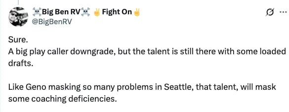 Instead of going into 2024 with the mindset to play out his contract (which rana through 2025) or to not worry about his future and focus on the next game, instead of believing he would play so good that he would retire with the Seahawks, Geno went into it like he had senioritis. Is it any coincidence that his QBR dropped by 10 points compared to his first two seasons with the only team that showed confidence in him after his career tanked?