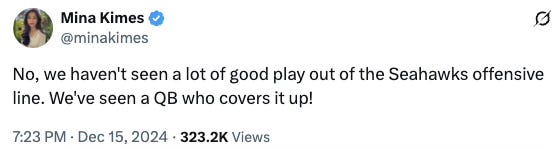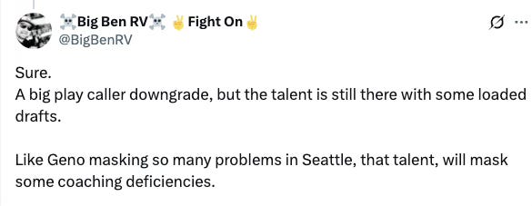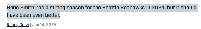 All that being said, the offense is more similar to 2024 than we might assume (the major changes are QB, LG, WR shifting, and upgrade AJ Barner) and in general the interior of the offensive line is still kind of bad. Zabel is both super talented and a rookie making rookie mistakes every week. Anthony Bradford is still really bad. The center position is serviceable. Abe Lucas is healthy but he did play half of last season too.