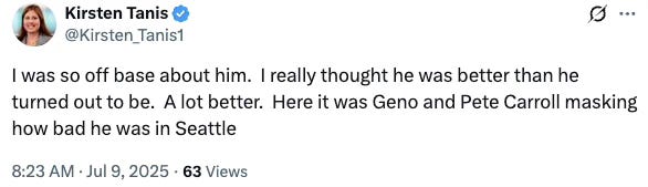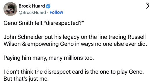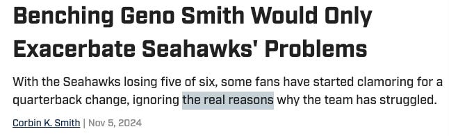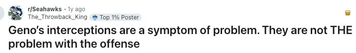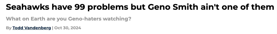 Bringing up evidence that the Seahawks actually elevate players and coaches to perform their best shouldn’t be banned just because it means having to unearth old tweets that so righteously criticized the franchise for “making Geno look bad” every time he looked bad. Maybe he was just bad for those games.