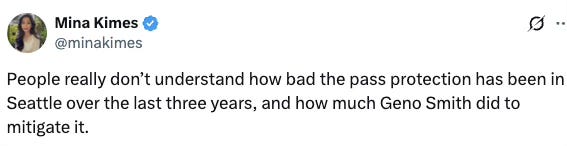 I agreed that the offensive line was not very defensible, but it’s illogical to argue that Smith was “masking” a problem that … EXISTED. If he was masking it then why did Smith take 50 sacks and throw 15 interceptions for an offense that only scored 22.1 points per game? (The Seahawks are averaging over 29 points per game this year.) How is that the definition of a mask?