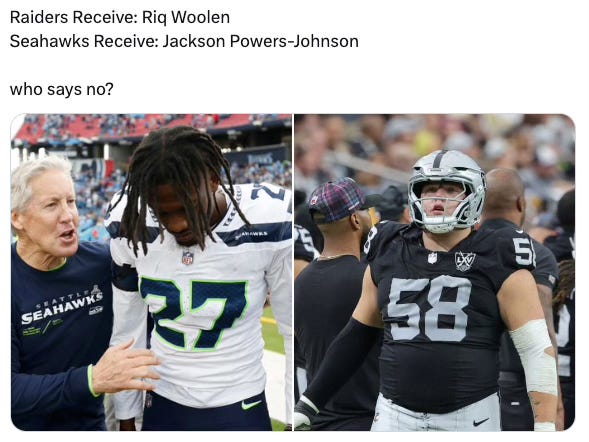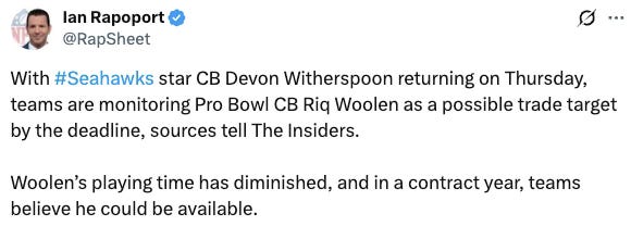 The Seahawks drafted Tariq Woolen in 2022, more than three years after this newsletter started*, and if his Seattle career ended right now he would be one of the best day three picks in the franchise’s history. That could be what happens next because when Ian Rapoport starts tweeting about your availability, it means that it is not a rumor; it is a message.