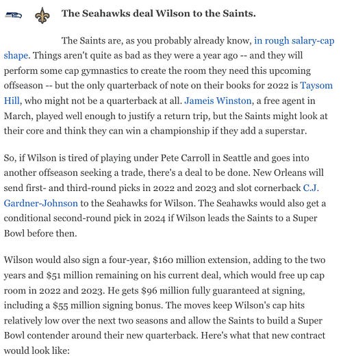 Jason La Canfora said that the Seahawks almost certainly wouldn’t meet Wilson’s contract deadline. Wilson signed a four-year, $140 million contract less than week after this speculative article about Seattle trading him and the rumors—obviously—died off for a little while.