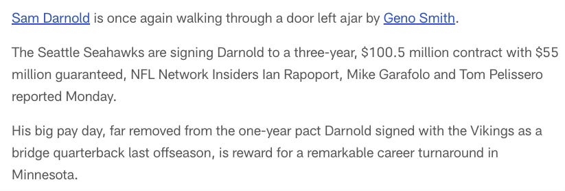 The Seattle Seahawks are signing QB Sam Darnold to a 3-year contract worth a little over $100 million, per Ian Rapoport. The contract has $55 million guaranteed according to Mike Garafolo, although this has not quite been specified by “what kind” of guaranteed money.
