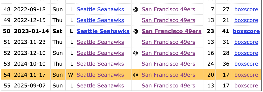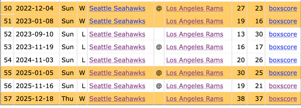 I was going to say that the Rams have been so much more of a roadblock to Seattle’s success since Sean McVay was hired in 2017, which is probably true, but then I remembered that the Seahawks have also lost seven of their last eight games against the 49ers.