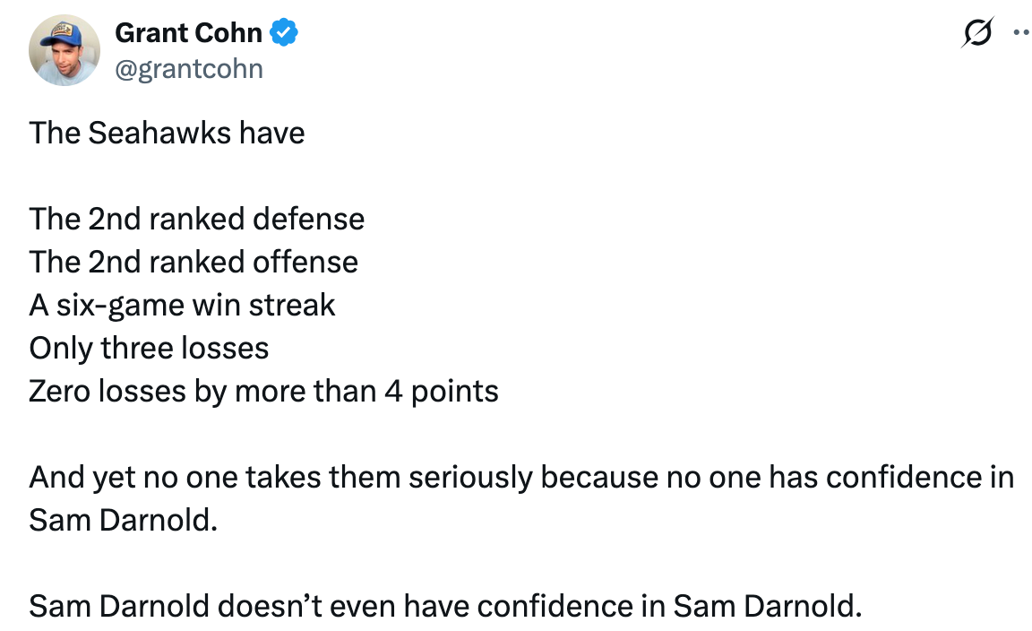 (Even if you hate Grant Cohn, he has a point about the media and opposing fans not taking the Seahawks as seriously as they would if the quarterback wasn’t Sam Darnold. Doesn’t mean that people are right, that’s just what the perception is until he proves them wrong.)