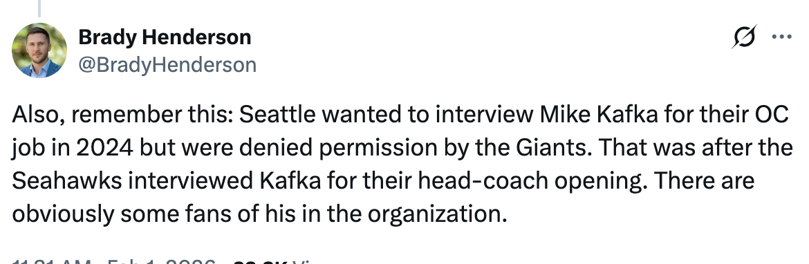 Mike Kafka was calling plays for the Giants for a couple of years, then Brian Daboll revoked those duties from him in 2024. Daboll gave back play calling duties to Kafka in 2025 and then Daboll got fired midseason. Kafka interviewed to be the OC for the Lions and the Bucs, both coveted play calling roles based on the promotions for previous coaches like Ben Johnson, Dave Canales, and Liam Coen.