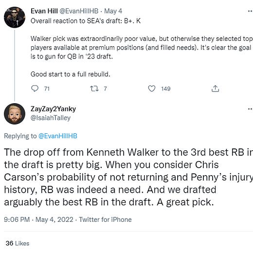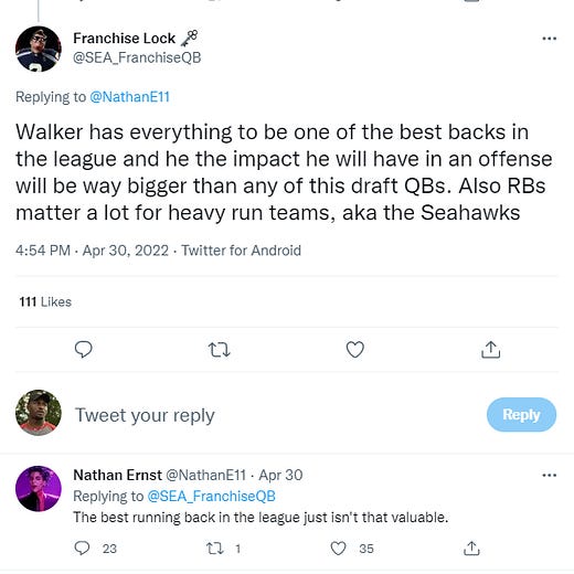 So I think this whole over-correction of needing to place the entire position in a box of relatively little value (which is what people are doing when they tweet that they don’t even need to know a single fact about Kenneth Walker III to “know” that he was a bad second round pick) is not something that those fans/media are coming up with on their own. It’s not an idea that they had or even one that they’ve fact checked and explored.