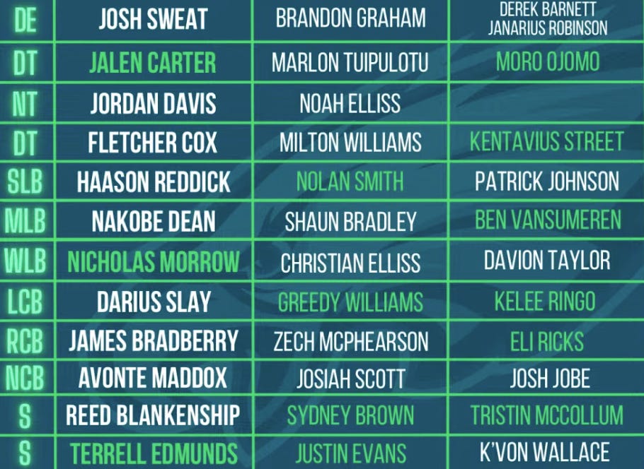 As you can see, he projects Jalen Carter as basically an immediate “starter” in the base package, alongside 2022 first round pick Jordan Davis and defensive linemen Fletcher Cox, Josh Sweat, and Brandon Graham. The Eagles have added Carter, Terrell Edmunds, and Nicholas Morrow, as well as Nolan Smith, another 2023 first round pick.