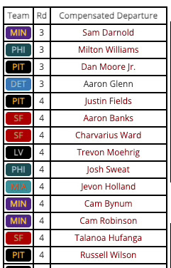 As you can see, the Steelers are in line for two fourth round picks for the “losses” of Justin Fields and Russell Wilson. The Seahawks would have gotten a sixth round pick for Laken Tomlinson, at best, but signing Darnold offset that compensation.