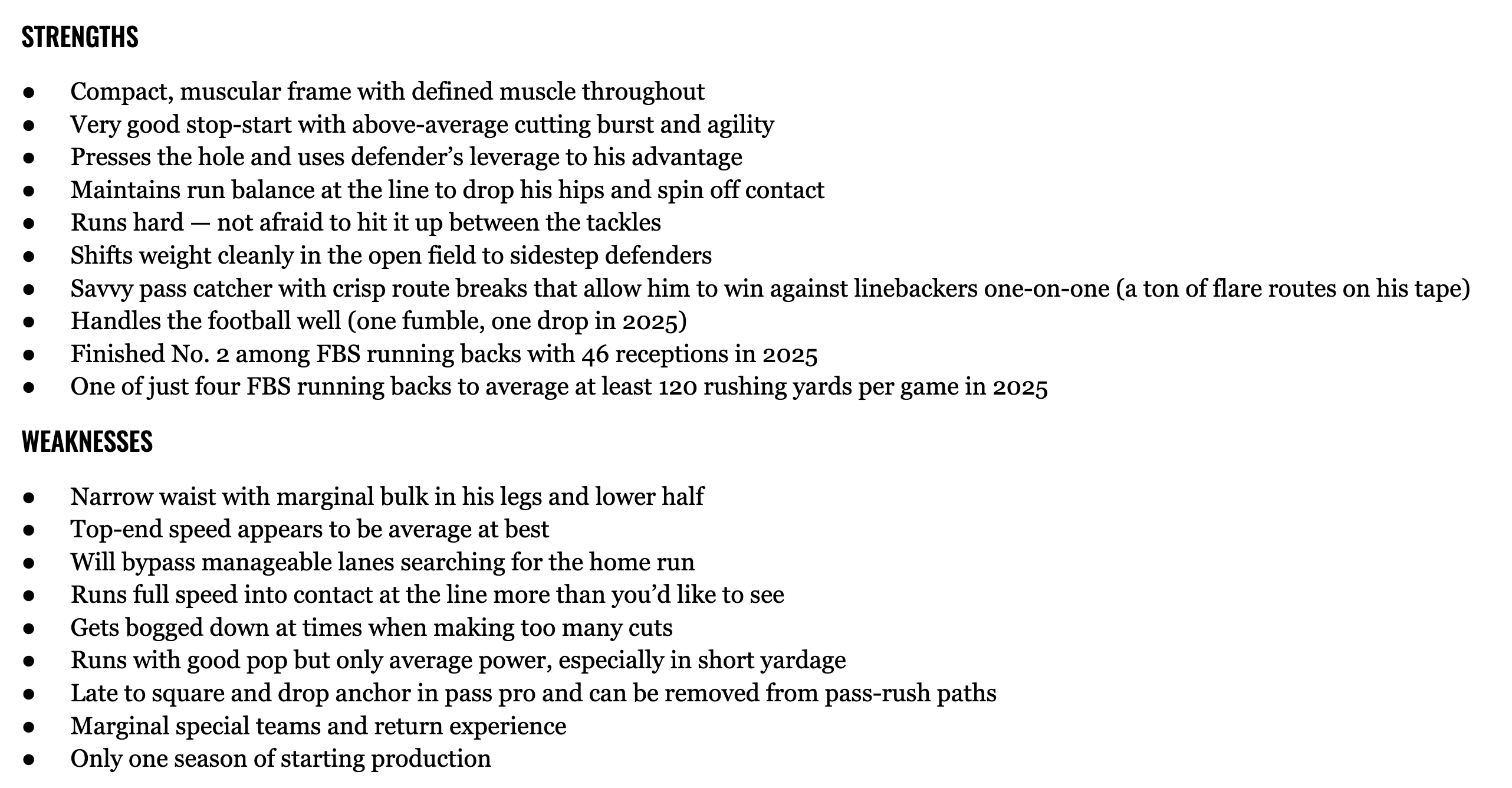 With his agile cutting skills, Johnson is explosive laterally and has sharp footwork and shifty body movements to give defenders the slip. His feet can get a little bounce happy at times, but he makes it work for him by pressing the line and setting up open-field defenders. Though he runs with determination, his average power will be more noticeable when dealing with NFL contact. Overall, Johnson is quick and balanced between the tackles to stack cuts, and his pass-catching savvy will be an asset at the next level, ideally for a zone scheme. He is an intriguing change-of-pace back who will bring versatility to an NFL backfield.