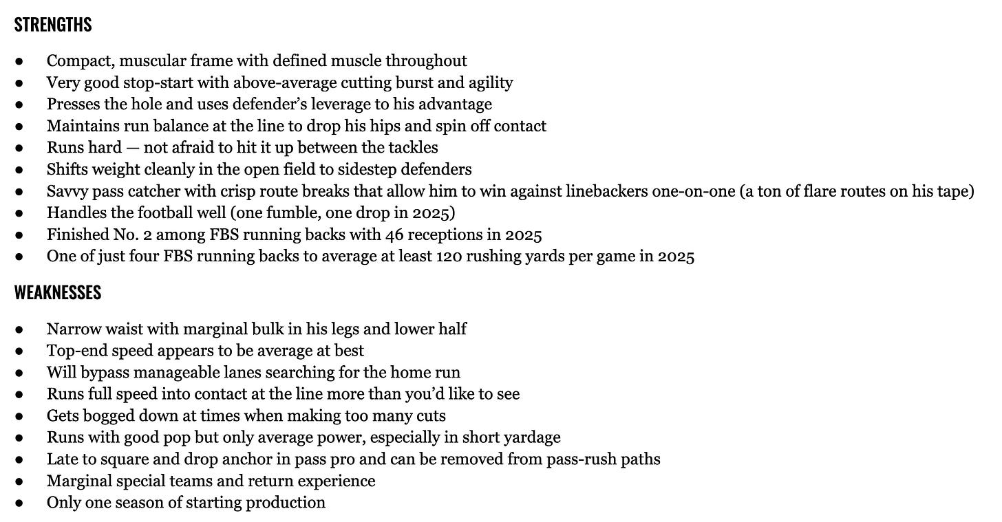 Of Emmett Johnson, Brugler gives him a 3rd-4th round grade and says this: