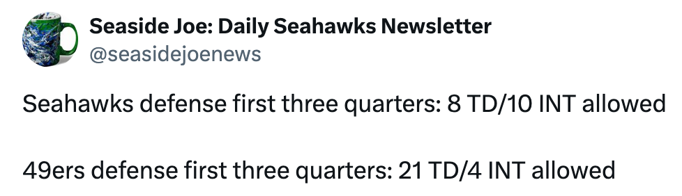 49ers defense is 25th in EPA/play, Seahawks are 2nd.