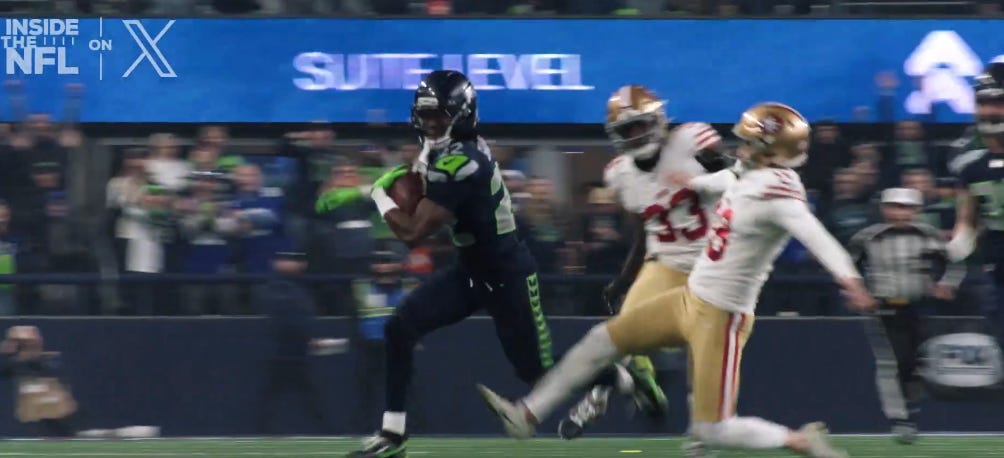Signs that the division game was going downhill from the start for Shanahan were apparent from the moment the very first drive (after Rashid Shaheed’s return of course), when the Seahawks stuffed Christian McCaffrey on third-and-1 (SF was the #1 third down team in 2025), then after a timeout by Seattle, tracked down a pedestrian call by the Niners to have Kyle Juszczyk either run it or pitch it on fourth down and he’s basically running like this: