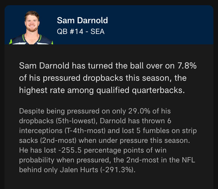 “Pocket awareness” can have different meanings in different settings, so I’m not sure if I’m exactly answering your request, but I haven’t had issues with Darnold when he’s given time to throw. Still leading the NFL in Y/A (9.2) from a clean pocket and top-10 passer when he’s not under pressure. Compare that to 22nd in passer rating when under pressure.