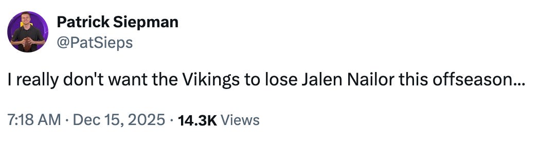 So I think in terms of bang-for-buck and still leaving the door open for a player like Horton to become a star if he’s healthy, Jalen Nailor would be the name I’d keep your eyes on in free agency. He’s not going to be a franchise savior or anything, but he could be twice as valuable as a receiver who makes three times as much.