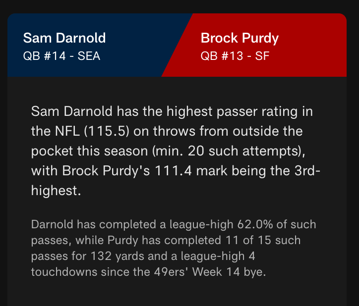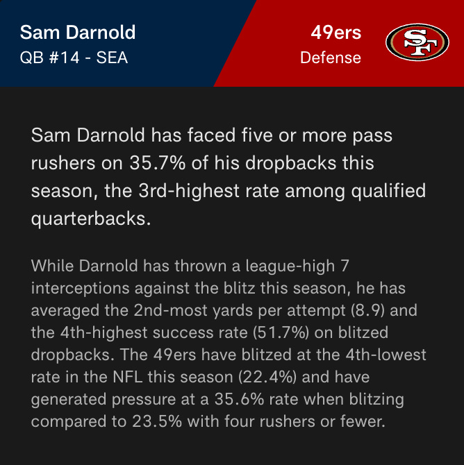 Although Darnold has thrown 8 interceptions from a clean pocket, Brock Purdy has actually thrown more INTs per pass from a clean pocket.