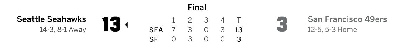 The Seahawks defense proved again to be the most dangerous asset of any team in the NFC playoffs and despite a game that was closer than Seattle liked or how they played (but what else is new?), the better team won the game 13-3. From controlling the game on the ground from both sides of the ball — 34/176/5.2 for the Seahawks and 12/53/4.4 for the Niners — to a win-sealing interception by Drake Thomas on a ball that was tipped by Boye Mafe, then dropped by McCaffrey, Seattle held onto win and will have the week off.