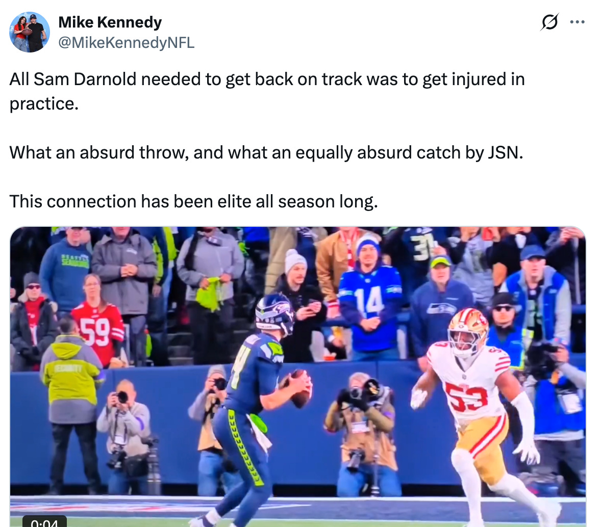 As I was saying, Seattle wasn’t going to need Sam Darnold in this one and they didn’t — he finished 12-of-17 for 124 yards — but he looked sharp and his arm had lightyear velocity on several needle-threading throws to Kupp. The same could be said for his 4-yard touchdown pass to Jaxon Smith-Njigba, who only finished with 19 yards because the Seahawks pulled their starters in the fourth quarter.