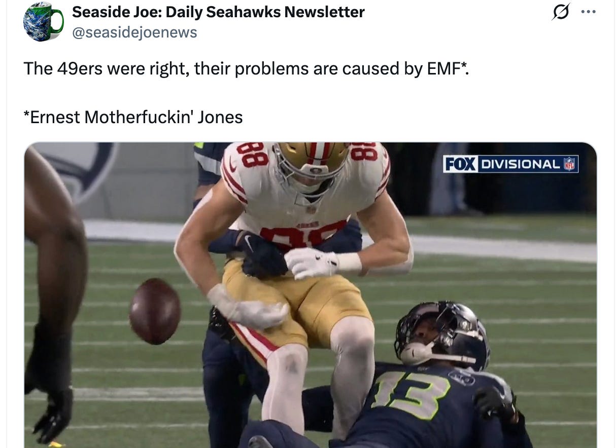 The Hawks’ ‘Nest (Er’nest Jones, that is) forced two turnovers, including a strip fumble against tight end Jake Tonges and an interception off of Brock Purdy, both plays all but guaranteeing that San Francisco’s efforts to move the ball against Seattle’s “Dark Side” defense were all for naught.