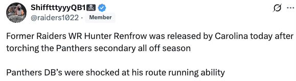 Of course, Renfrow is a much different type of receiver than MVS and he wasn’t even in the league last year. But if you needed insurance in camp with experience, there were MANY options available. It’s just ludicrous to look back at the MVS signing now and know that the team was going to make him fight for a roster spot as if he was no different than a guy like Renfrow.