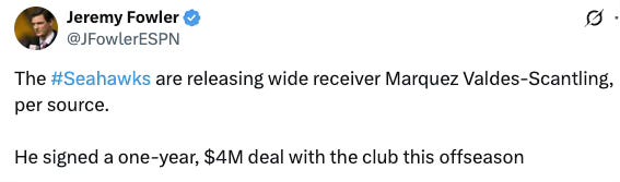 You will never hear me complain that the Seahawks released Marquez Valdes-Scantling…But consistently giving away money to the types of players — like MVS — who are readily available at any time of year because you didn’t have a plan that necessitated that player on the roster when you guaranteed his contract?