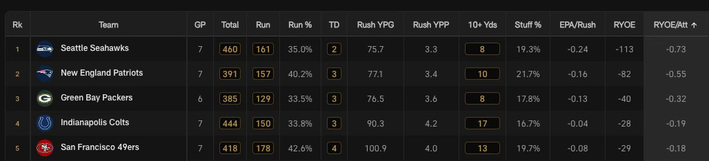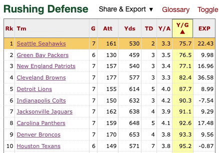 As of Week 8, the Seahawks are allowing the fewest rushing yards per game in the NFL at 75.7, they’re tied with the Rams for the fewest rushing touchdowns allowed this year at 2, and they’re tied with the Browns for the fewest yards per carry allowed at 3.3.