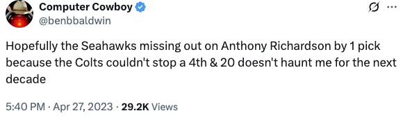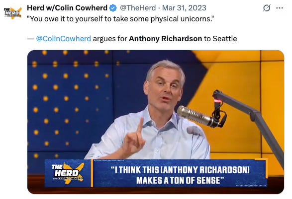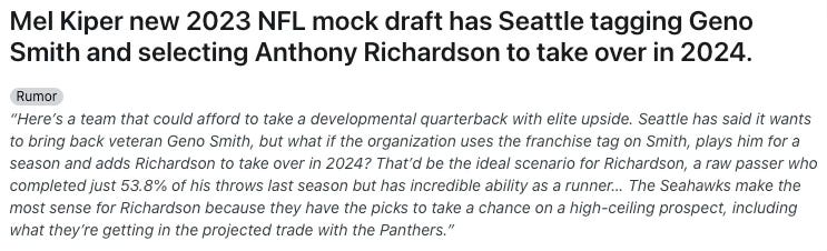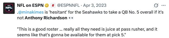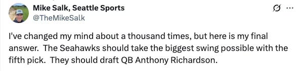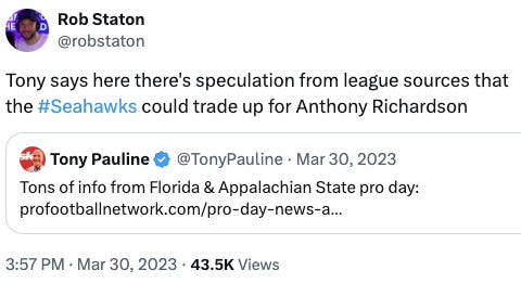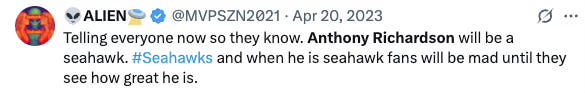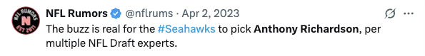 And with each passing take that Seattle couldn’t afford to waste their opportunity to frivolously spend a top-5 pick “because it wasn’t theirs to begin with” (not an argument that makes any sense), the Seahawks became the most popular mock destination for Richardson: