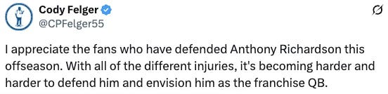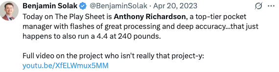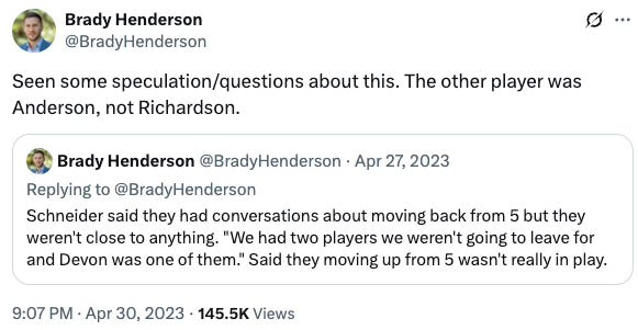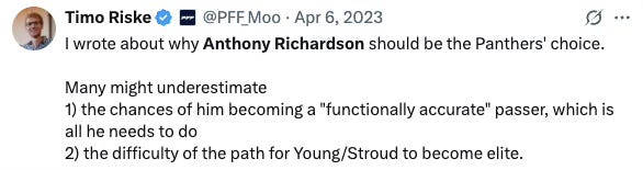 Although this rumor has been widely accepted as a fact, the notion that Pete and John were prepared to draft Richardson at 5 is actually twisting words around to fit the narrative that they wanted us to believe was real before the draft. Pete and John separately said after the draft that they definitely considered Richardson, just as they considered Bryce Young, C.J. Stroud, and Will Levis.