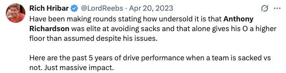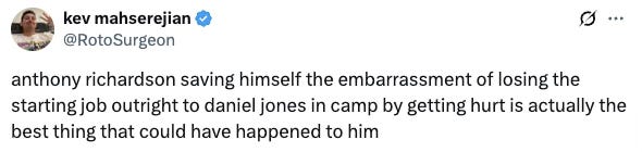 There were so many tweets, articles, and podcasts about how great it would be if Richardson spent a year or two behind Smith (it didn’t help that the Seahawks appeared to have genuine interest in him) but starting him would have been the same as tanking, while sitting him would be the same as failing him.