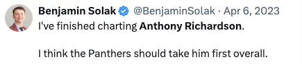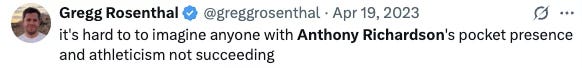 Randy Mueller had Richardson as a Day 3 pick who would take five years to develop and who might never be good enough to start. He also suspected that Jim Irsay would force an unwilling Colts staff to draft Richardson at #4. (FWIW, RM had Bryce Young as a Day 2 pick and thought that some teams wouldn’t have Young on their board at all.)
