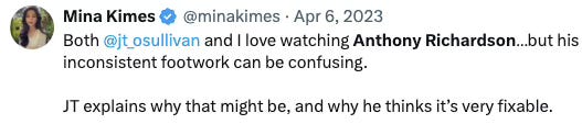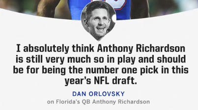 I’ve watched every game he’s played for Florida, just as I’ve watched every game for each of the top quarterbacks in the 2023 draft. I’m not going to try and argue that Richardson doesn’t have room to grow or clear areas where he can improve…Plenty of the other big names have their own flaws and concerns that aren’t talked about as often…What he lacks in experience he makes up for with extreme physical brilliance — the kind that we’ve only seen with the likes of Josh Allen in recent history. That’s not to say it’s an apples for apples comparison. For example, Richardson is an even better runner.