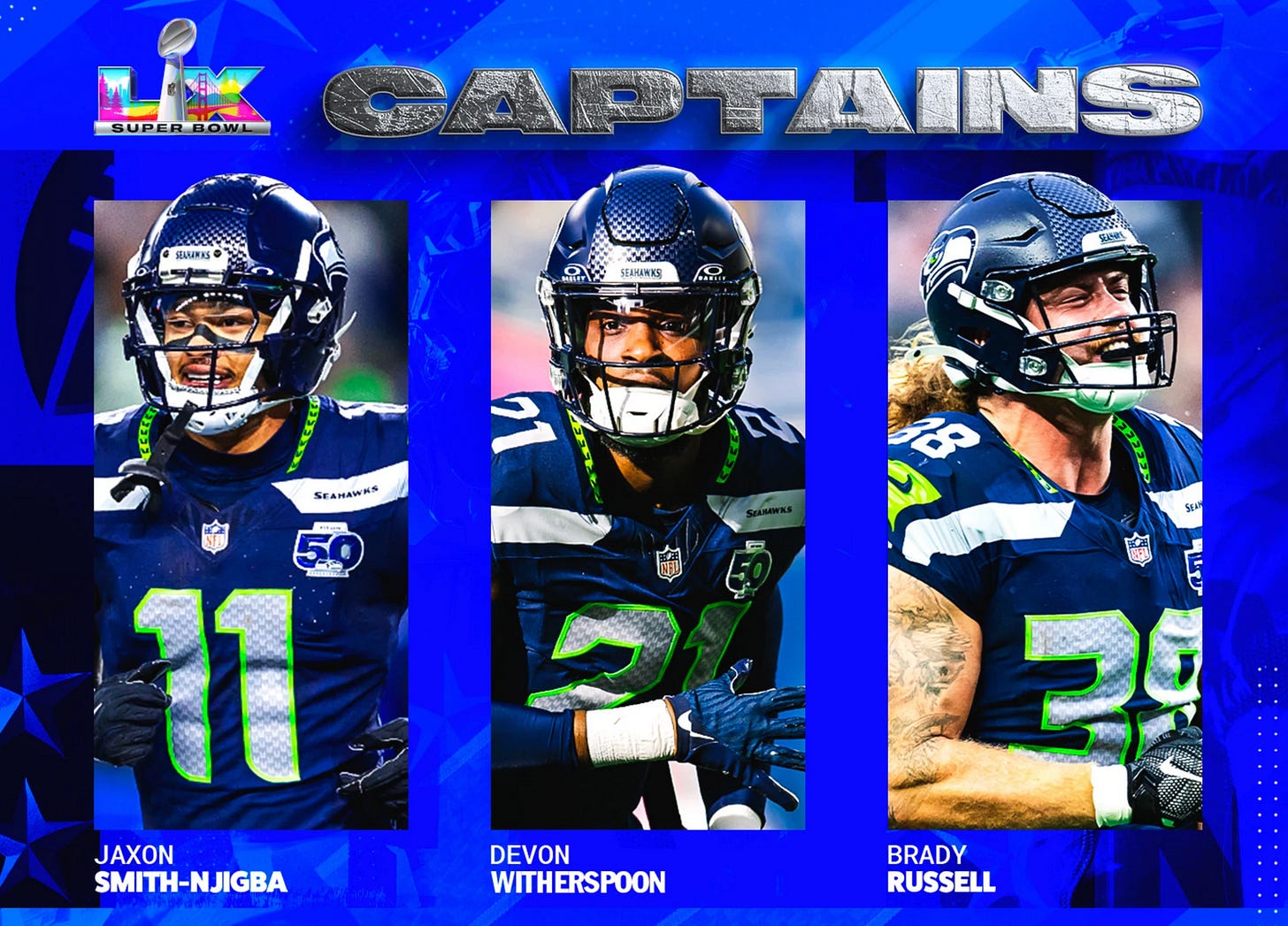 (Fittingly the captains are a celebration of the Russell Wilson trade (a pick used on Devon Witherspoon+a guy named Russell) and beating every other team in the 2023 draft.)