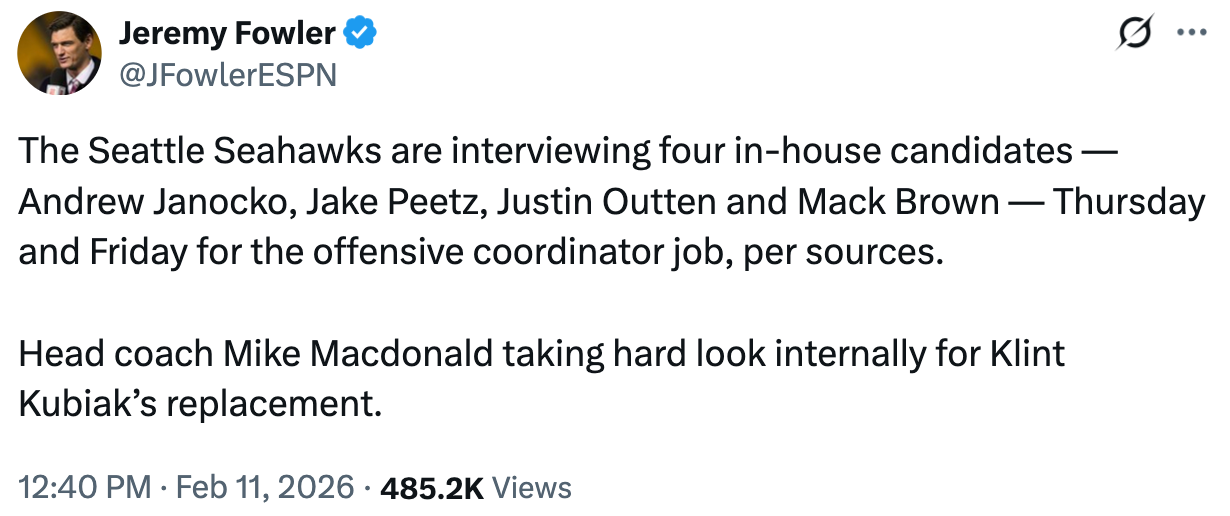 The Seahawks OC search is scheduled for Thursday and Friday, but they will have to interview at least one outside candidate to be compliant with the Rooney Rule and perhaps that person will win the job.