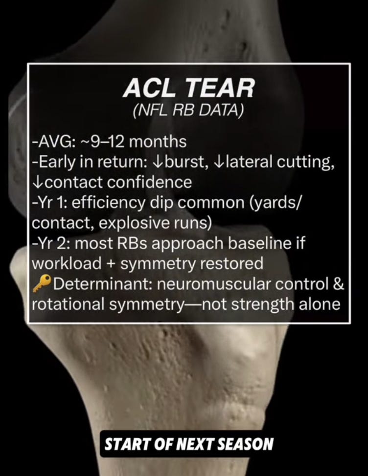 One social media doctor covered how the injury happened and what exactly was torn and why. If you believe any of those guys who evaluate injuries online (I don’t necessarily see a reason to distrust some of them and could a person fake an explanation like ones with this much medical detail?) then Charbonnet’s timeline is 9-12 months.