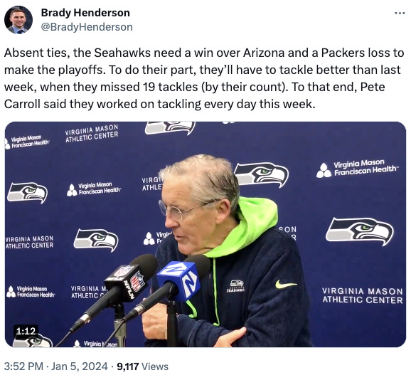 In 226 regular season games as the Seahawks head coach, Carroll has made sure that Seattle has only been mathematically eliminated from playoff contention in THREE of those contests. Even in three years with the Patriots, New England made the playoffs twice and unless I’m mistaken not eliminated until Week 16 in his final year. (After starting 6-2 in 1999, the Patriots lost six of the last eight and Carroll was fired. Seattle started 6-3 and a loss would mean the Seahawks had dropped six of the last eight.)