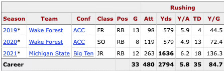 Walker is also a player who was once doubted at Wake Forest for being “good, not great” in a bad scheme for running backs, transferred to Michigan State’s good scheme for backs, and then led the country in rushing yards.