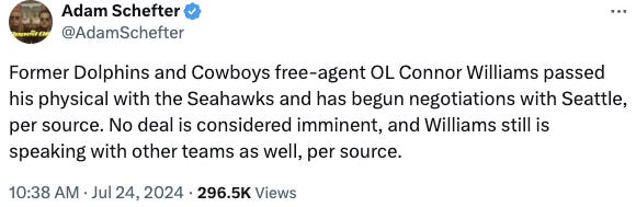 It is unsurprising then that the Seahawks have already had a meeting with former Cowboys, Dolphins guard/center Connor Williams and gave him a passed physical grade after the 27-year-old spent the offseason as a free agent because he tore his ACL on December 11. The diagnosis on Williams’ knee was thought to be dire, with his own agent Drew Rosenhaus calling it “pretty significant” in March, but four months later it seems he’s ready for his next opportunity.