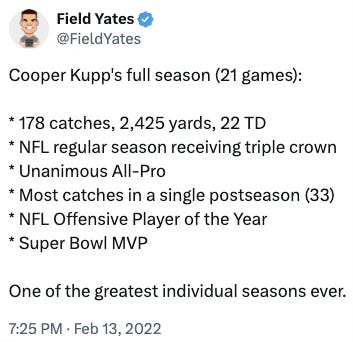 The list of players who “happened” to get better while being on a team with Kupp is just as remarkable as his own resume, which by the way has him ranked ninth in receiving yards since 2017. Bourne, Puka, JSN, not to mention that Robert Woods had his best seasons while playing next to Kupp; Brandin Cooks had his best season while playing next to Kupp; Van Jefferson and Josh Reynolds had their best seasons playing next to Kupp; Odell Beckham Jr. had an incredible playoff run and won a Super Bowl playing next to Kupp.