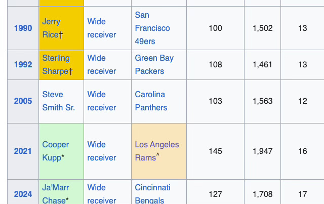 Last season, another seven players had at least 70% catches and 8 yards per target, including Ja’Marr Chase, who reached the receiver “triple crown” just three years after Kupp did it; leading the NFL in catches, yards, and touchdowns had only happened three times between 1967 and 2020. Now it’s happened twice in the last four years.