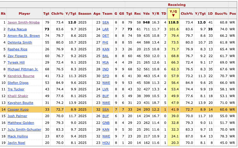 Kupp has the 19th-largest salary cap in 2025 among all receivers but ranks 67th in both total receiving yards and yards per game, whereas his 72.7% catch rate is 24th among wideouts and his 8.9 yards per target is 36th.