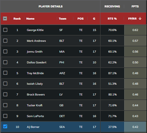 Barner ran a route on 27.5% of his plays last season, which is a really, really low percentage if he ends up being Seattle’s top receiving tight end in 2025. Consider this list by Fantasy Points Data, which highlights Barner as a very valuable receiver when he actually runs a route: